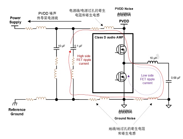 地噪聲來源分析:由于開關紋波電流流過寄生電感/電阻,造成參考地(Reference Ground)和功放地之間的電壓偏差。地噪聲會通過音頻功放傳導至喇叭線(或者其他走線)影響傳導/輻射測試結果。