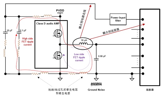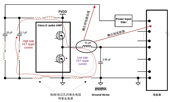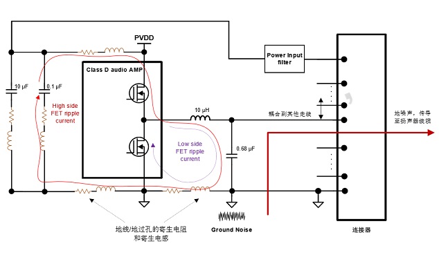 地噪聲來源分析:由于開關紋波電 流流過寄生電感/電阻,造成參考地(Reference Ground)和功放地之間的電壓偏差。地噪聲會通過音頻功放傳導至喇叭線(或者其他 走線)影響傳導/輻射測試結果。