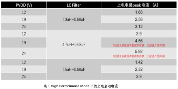 在此處PVDD為功放供電電壓 Duty為無(wú)輸入信號(hào)時(shí)的PWM輸出Duty Cycle,即占空比下表列出了不同供電電壓下不同LC Filter上電啟動(dòng)時(shí)電感上的電流: