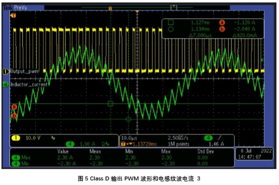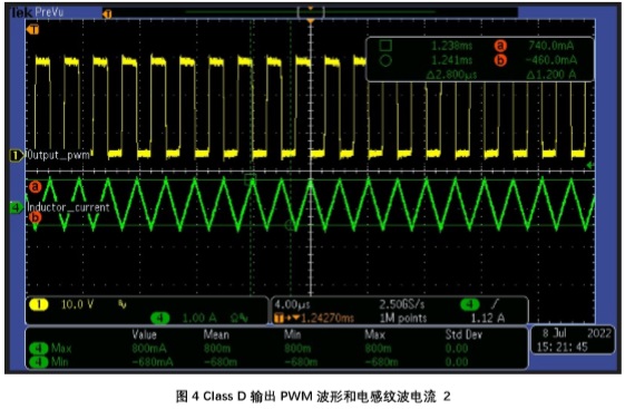 在上圖中綠色波形為流過(guò)電感電流,黃色波形為音頻功放輸出 PWM 波形。