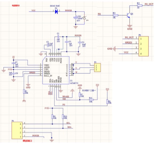 7. FG管腳的耐壓是5V,注意ACM6753的輸出是開漏,F(xiàn)G pin上需要上拉電阻到3.3V或者5V.如果外部FG的電壓是>5V, 需要添加三接 管Q1做隔離. Q1的集電極輸出端作為FG的最終輸出.三極管Q1 的輸出這里串了一個電阻R2,這個電阻不能太大,不然FG_OUT 信號的低電平做不到足夠低。 FG_OUT一定要有上拉電阻上拉到外部高壓哈, 和客戶(或者客戶的客戶)溝通好