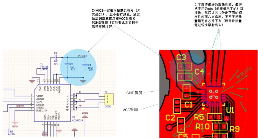 1 . SPEED pin盡量留一個上拉電阻(圖中R5),這樣上電后芯片不會立即進(jìn)入低功耗模式。如果沒有這個上拉電阻,同時前級PWM又是接地的話,芯片會進(jìn)入低功耗模式。如果是I2C模式控制芯片調(diào)速,是一定需要SPEED pin上拉的。 如果是燒寫固定死參數(shù)的方式, 則SPEED pin不是很有必要一定要上拉,為了節(jié)省面積的話可以不用 。