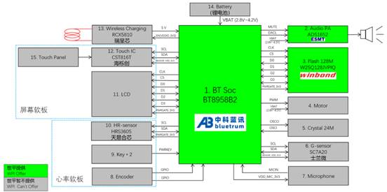 圖示3-大聯(lián)大世平基于中科藍(lán)訊產(chǎn)品的智能手表方案的方塊圖