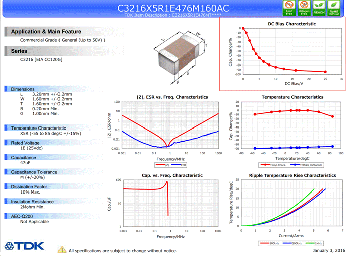 靜態(tài)容量隨其直流偏置工作電壓的增大而減少,最大甚至會下降90%。比如一個X5R 47UF 25V的電容,在25V的直流電壓下,其容量可能只有4.7uF,下圖附錄TDK 一個X5R電容的規(guī)格書 關(guān)于容量與電壓的關(guān)系圖,(其實仔細看下圖的的話,你會發(fā)現(xiàn)電容容量溫度跟容量也有關(guān)系)