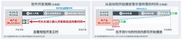 新產(chǎn)品是由硬件構(gòu)成的,與由微控制器構(gòu)成的產(chǎn)品相比,無需進行軟件驗證,可以大幅縮短開發(fā)周期。此外,新產(chǎn)品可以用簡單的命令進行控制,與由微控制器生成聲音的普通方式相比,用不到1/10的時間即可發(fā)出警示音。除此之外,新產(chǎn)品還配有故障檢測功能,可檢測與主控微控制器之間的通信異常以及由外置元器件引起的異常振蕩,有助于提高應用產(chǎn)品的可靠性。