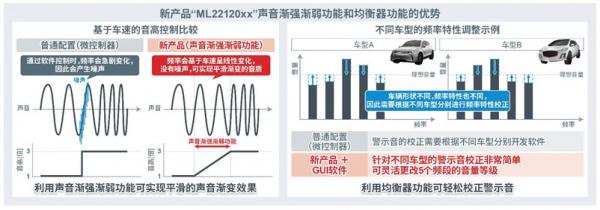 “ML22120xx”由具備警示音生成功能、聲音漸強漸弱功能和均衡器功能的專用硬件構(gòu)成。另外,通過使用專用的GUI軟件,可以輕松滿足相關法律法規(guī)對AVAS所需的音量和頻率特性等的規(guī)定*2。