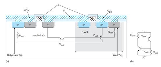 閂鎖是 CMOS 芯片中發(fā)生的一種短路現(xiàn)象。CMOS 傾向于在 V DD和 GND之間形成低電阻路徑,從而導(dǎo)致嚴(yán)重熔毀并增加 IC 的故障率。理論上,當(dāng)由襯底、阱和擴(kuò)散形成的寄生雙極晶體管導(dǎo)通時(shí),就會(huì)發(fā)生閂鎖。