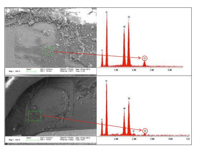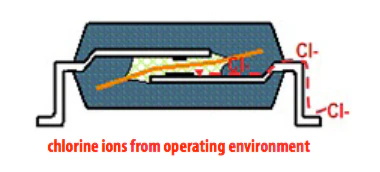 鹵化物是離子性的并且?guī)в须姾桑焕,Cl‐、Br‐ 和 F‐。氯是電負性強的離子,該物質(zhì)通過 Vcc(電源)電勢引起的電場漂移遷移到封裝中。Vcc(電源)焊盤通常是個受到氯相關(guān)問題“攻擊”的焊盤。一般來說,GND(地)焊盤一般不會被腐蝕,因為該焊盤一般處于地電位或電位。Vcc(電源)焊盤通常是個受到氯相關(guān)問題“攻擊”的焊盤。一般來說,GND(地)焊盤一般不會被腐蝕,因為該焊盤一般處于地電位或電位。這表明不需要對鉛模具界面進行分層以使離子污染物進入。僅僅存在離子物質(zhì),在存在水分和電位差等加速因素的情況下,足以啟動離子污染過程。圖 1 顯示了環(huán)境中的氯離子如何進入封裝并腐蝕焊盤的機制。圖 2 顯示在引線框架與模制化合物(未分層)之間的界面處發(fā)現(xiàn)了氯,圖圖3顯示了由于使用鹵化物助焊劑而導(dǎo)致的焊盤腐蝕。