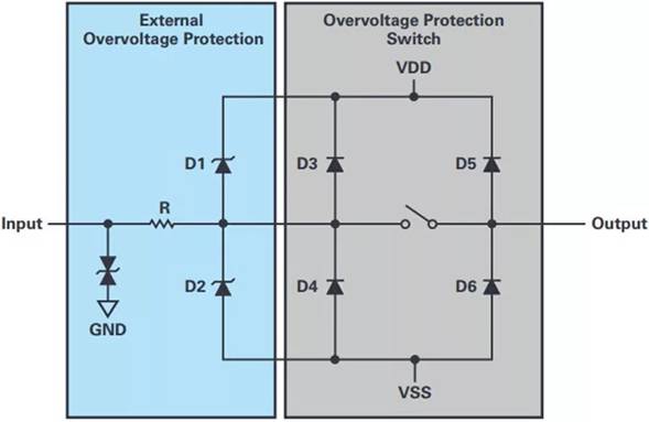 通常,常見的簡單設(shè)計方法是使用外部保護二極管,通常是瞬態(tài)電壓抑制器(TVS)二極管,安裝在信號線和電源線或接地線之間。TVS二極管相當(dāng)有用,因為他們可以快速對瞬態(tài)的電壓峰值作出反應(yīng)。圖1左側(cè)所示的就是這種類型的外部過壓保護。