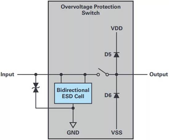 圖2. 配有集成式雙向ESD單元的過壓保護。