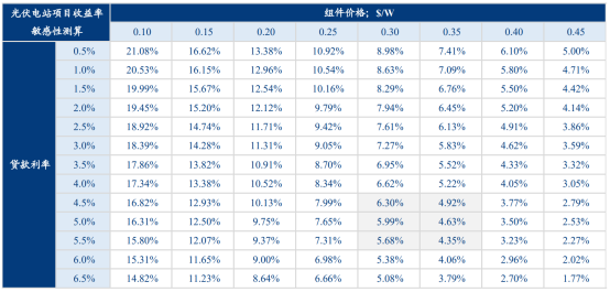 根據(jù)華創(chuàng)證券的光伏電站項(xiàng)目收益率敏感性測(cè)算表,假設(shè)貸款比例 70%,貸款利率 5.5%。組件價(jià)格在 0.15$/W 時(shí),貸款利率提升1%,對(duì)于收益率下降約0.85%-0.95%。