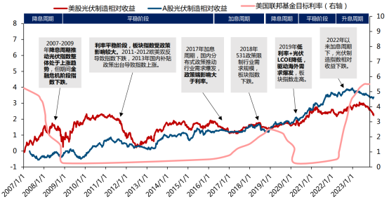復(fù)盤歷史,2019年,光伏板塊指數(shù)靠著光伏平價(jià)帶來行業(yè)市場(chǎng)化拐點(diǎn)和降息帶來的融資成本下降刺激海外需求上升兩大因素持續(xù)走高。然而,歷史總是驚人的相似。如今產(chǎn)能過剩促使光伏組件價(jià)格加速下跌,甚至跌破部分成本價(jià),帶動(dòng)光伏LCOE再次降低;美聯(lián)儲(chǔ)也會(huì)在2024年開始新一輪降息周期。兩因素的疊加會(huì)大大增加光伏電站的收益率,促使光伏電站加速建設(shè)。