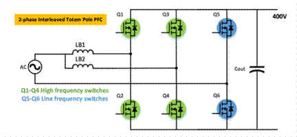 在中高功率的功率因子校正應用(通常為6.6kW及以上)中,無橋圖騰柱拓撲變得越來越普及。如圖2所示,在這種拓撲中,慢橋臂(Q5-Q6)以電網(wǎng)頻率(50-60Hz)開關,而快橋臂(Q1-Q4)則會進行電流整形和升壓,并在硬開關模式下以更高頻率(通常為65-110kHz)運行。盡管無橋圖騰柱拓撲大幅提高了效率并減少了功率元件的數(shù)量,但它提高了控制方面的復雜性。