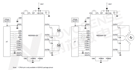 NSD8381-Q1驅(qū)動(dòng)步進(jìn)電機(jī)和2顆DC電機(jī)應(yīng)用圖