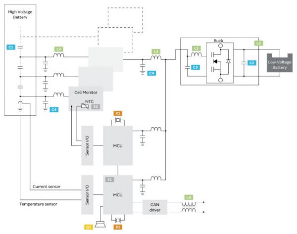 BMS的性能取決于其內(nèi)置控制功能的多樣性和精度。但是,要實現(xiàn)高性能,其大前提是檢測電芯的動作和狀態(tài)的傳感器和BMS電路中使用的許多電子元件具有高精度(下圖)。此外,由于需要監(jiān)控大量電芯,所以BMS電路構(gòu)成本身變得非常復(fù)雜,需要更小、更輕的傳感器和元件。