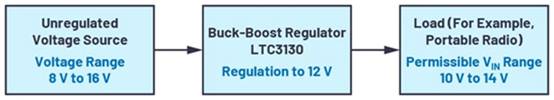 圖1所示為這類應(yīng)用的系統(tǒng)示意圖。便攜式無(wú)線電設(shè)備由電池提供電壓。負(fù)載可以接受介于10 V和14 V之間的電壓,但電壓源的輸出范圍可能為8 V至16 V。那么內(nèi)插的降壓-升壓穩(wěn)壓器可以在輸出端將電壓轉(zhuǎn)換為12 V。如果電源電壓略低于12 V,轉(zhuǎn)換器采用升壓模式工作,如果電源電壓高于12 V,則采用降壓模式工作。
