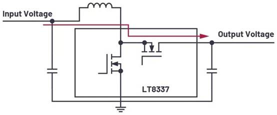 除了降壓-升壓解決方案(LT8210),升壓穩(wěn)壓器也支持直通模式。ADI公司新推出的 LT8337 Silent Switcher ® 升壓穩(wěn)壓器本身集成了直通模式。圖3展示了LT8337升壓轉(zhuǎn)換器背后的這一概念。啟用直通模式時(shí),高端開(kāi)關(guān)永久開(kāi)啟,低端開(kāi)關(guān)永久關(guān)閉。