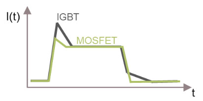 IGBT是雙極性器件,導(dǎo)通時電子和空穴共同參與導(dǎo)電,但關(guān)斷時由于空穴,只能通過復(fù)合逐漸消失,從而產(chǎn)生拖尾電流,拖尾電流是造成IGBT關(guān)斷損耗的大的主要原因。SiC MOSFET是單極性器件,只有電子參與導(dǎo)電,關(guān)斷時沒有拖尾電流使得SiC MOSFET關(guān)斷損耗大大低于IGBT。