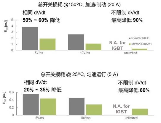 IGBT開通瞬間電流往往會有過沖,這是反并聯(lián)二極管換流時產(chǎn)生的反向恢復(fù)電流。反向恢復(fù)電流疊加在IGBT開通電流上,增加了器件的開通損耗。IGBT的反并聯(lián)二極管往往是Si PiN二極管,反向恢復(fù)電流比較明顯。而SiC MOSFET的結(jié)構(gòu)里天然集成了一個體二極管,無需額外并聯(lián)二極管。SiC體二極管參與換流,它的反向恢復(fù)電流要遠(yuǎn)低于IGBT反并聯(lián)的硅PiN二極管,因此,即使在同樣的dv/dt條件下,SiC MOSFET的開通損耗也低于IGBT。另外,SiC MOSFET可以使得伺服驅(qū)動器與電機(jī)集成在一起,從而摒除線纜上dv/dt的限制,高dV/dt條件下,SiC的開關(guān)損耗會進(jìn)一步降低,遠(yuǎn)低于IGBT。即使是開關(guān)過程較慢時,碳化硅的開關(guān)損耗也優(yōu)于IGBT。