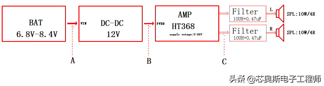 3). DC-DC輸出端的電解電容耐壓值應該選取25V,包括功放供電腳的電容也一樣;