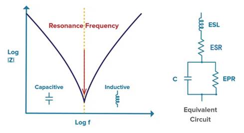 理想電容器的數(shù)學(xué)描述是:隨著頻率的增加,阻抗|Z|趨近于零。實(shí)際測試則顯示,阻抗的頻率邊界與具體應(yīng)用和元件本身有關(guān)。在該邊界處,電容器的等效串聯(lián)電感 (ESL) 會(huì)與自身形成LC諧振回路,這就是所謂的自諧振頻率(SRF)。在自諧振頻率范圍內(nèi),電容器會(huì)發(fā)揮應(yīng)有的功用;超過這個(gè)頻率,電容器就開始像電感器一樣工作,從而阻礙交流電流。