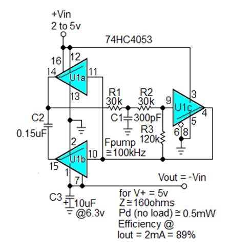 U1a和U1b與C2結(jié)合形成反相電容器電荷泵,將電荷傳輸?shù)綖V波電容器C3。電荷轉(zhuǎn)移發(fā)生在一個周期中,該周期以 C2 通過 U1a 充電到 V+ 開始,然后通過 U1b 將 C2 部分放電到 C3 來完成。在 U1c 施密特觸發(fā)器型振蕩器的控制下,泵浦頻率約為 100 kHz,因此每 10s 就會發(fā)生電荷轉(zhuǎn)移。注意 U1c 周圍通過 R3 的正反饋和通過 R1、R2 和 C1 的反向反饋。