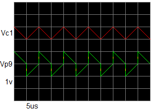 生成的(近似)振蕩器波形(Vc1 和 U1c Vpin9)如圖 2所示。
