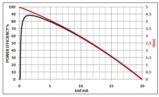 空載功耗小于 500 W,大致平均分配在 U1 和振蕩器 RC 網(wǎng)絡(luò)之間。當(dāng) Vout 輕載時,它將地接近 -1.0 x V+。在負(fù)載下,它會以~160 mV/mA的速度下降。