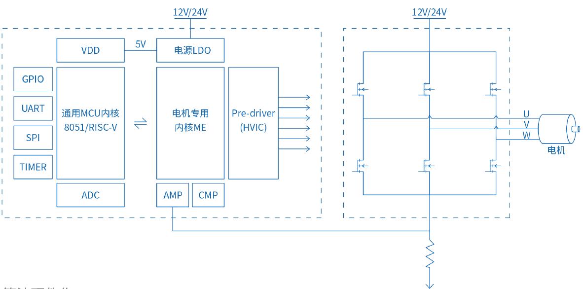 1、雙核設(shè)計(jì),8051 內(nèi)核+ ME內(nèi)核(FOC控制模塊、方波控制模塊、MDU支持乘除法/低通濾波器(LPF)/三角函數(shù)的計(jì)算、比例積分/微分器(PI/PID));