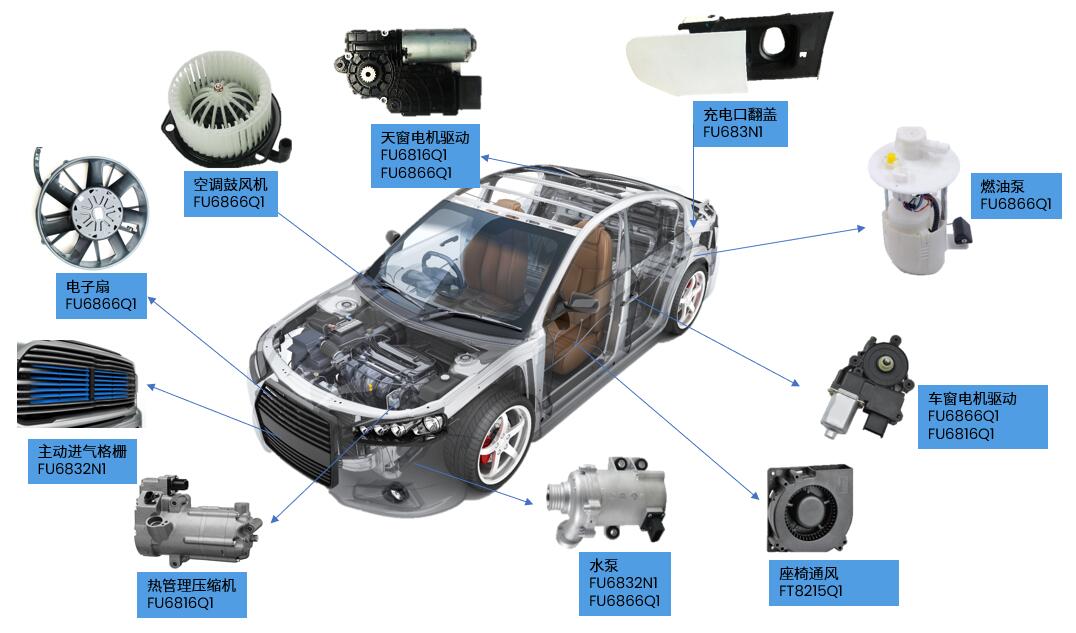 FU6866Q1溫度等級(jí)為 Grade 1,芯片工作時(shí)TJ(-40 –150 ℃),TA(-40 –125 ℃),可以廣泛應(yīng)用在車(chē)身控制的相關(guān)電機(jī)控制領(lǐng)域中,包括熱管理系統(tǒng)水泵、電子扇、玻璃升降控制、座椅電機(jī)控制、尾門(mén)電機(jī)等。