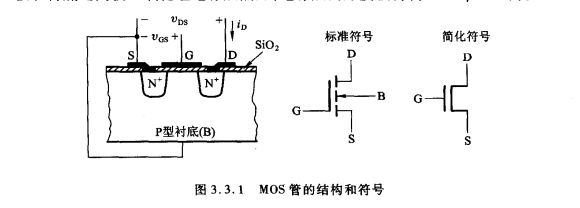 圖3.3.1 中的 MOS 管屬于 N 溝道增強型。這種類型的MOS管采用P型襯底,導電溝道是 N 型。在vC5=0時沒有導電溝道,開啟電壓Vcs(u)為正。工作時使用正電源,同時應將襯底接源極或者接到系統(tǒng)的電位上。在圖3.3.1給出的符號中,用D S間斷開的線段表示Vcs=0時沒有導電。