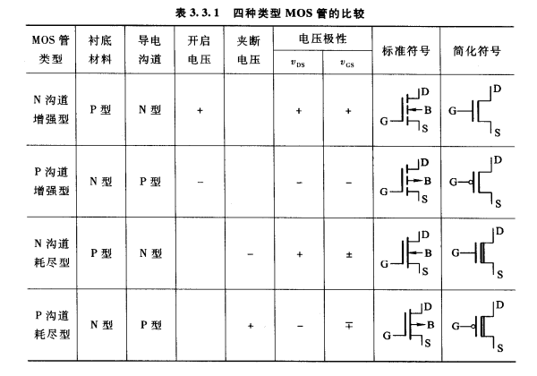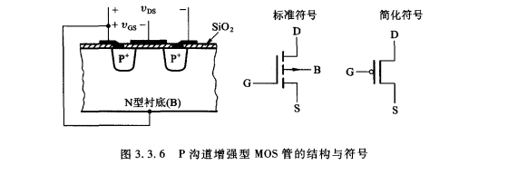 P 溝道增強型 MOS 管的符號如圖3.3.6中所示,其中襯底上指向外部的箭頭表示導電溝道為 P型!