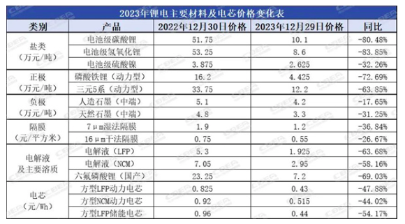 依此,用“風(fēng)云突變”來形容鋰電原材料和電芯的2023年價格走勢一點不為過。在此背景下,我們分別從鋰電上游原材料、正負極、隔膜、電解液、電芯等角度,回顧鋰電產(chǎn)業(yè)鏈價格“跌宕”的2023年,并借此研判2024年產(chǎn)業(yè)發(fā)展格局。