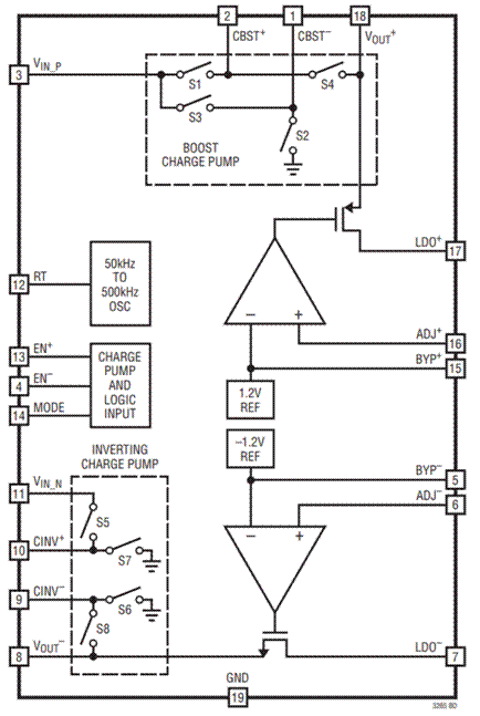 圖2 - ADI LTC3265的內(nèi)部看是電荷泵架構+LDO架構,實現(xiàn)了穩(wěn)定的正、負電源輸出。