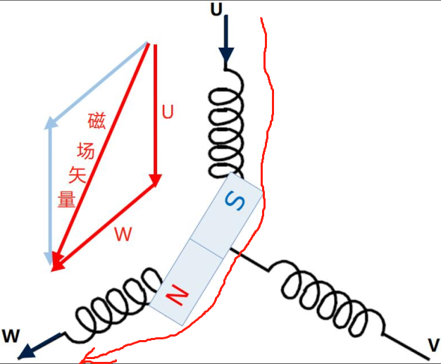 根據(jù)右手定則,通電的導體產(chǎn)生的磁場方向可以知道:當U-W相通時,兩個線圈產(chǎn)生的磁場進行合成,就是磁場矢量。(磁體之間,存在同性相斥,異性相吸的原理)
