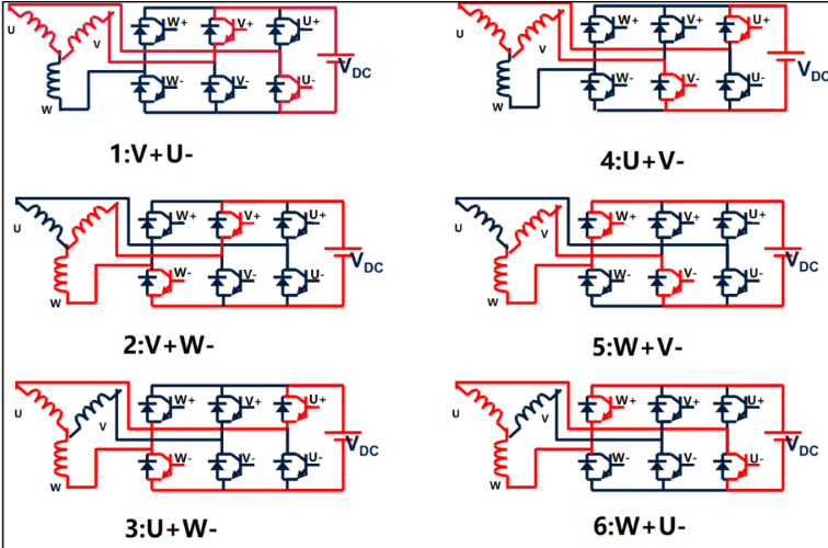 V+U- W+U- W+V- U+V- U+W- V+W- (有一個特點:按照UVW這個順序變化的是正轉(zhuǎn))W+ W+ U+ U+ V+ V+,負也是這樣的。