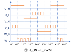 H_ON – L_PWM:某一相上半橋始終保持高電平(也就是上半橋常開導通),另一相下半橋始終以PWM方式控制