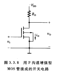 P 溝道增強(qiáng)型 MOS管的符號如圖3.3.6 中所示,其中襯底上指向外部的箭頭表示導(dǎo)電溝道為 P型。圖3.3.7 是 P 溝道增強(qiáng)型 MOS管的漏極特性。用P溝道增強(qiáng)型 MOS管接成的開關(guān)電路如圖3.3.8 所示。當(dāng)v=0時(shí),MOS管不導(dǎo)通,輸出為低電平VoLo只要R遠(yuǎn)小于 MOS管的截止內(nèi)阻.RorF,則。VoL≈VvD。