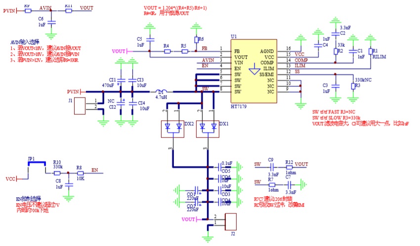 上圖中,PVIN 為外部供電電源,VOUT 為升壓目標值,AVIN 為 HT7179 PIN3。HT7179 的VIN 管腳,耐壓為18V,給整個芯片模擬部分供電。顧在實際應(yīng)用當中,若 VOUT升壓設(shè)定值小于18V,建議直接將VIN管腳連接至VOUT,上圖中短接R11。若VOUT設(shè)定值需大于18V,VIN接PVIN。當PVIN大于12V,可以增加R9,R9 與C6 形成一個 RC 濾波,使得VIN 電壓更穩(wěn)定。R9一般為幾百歐姆。
