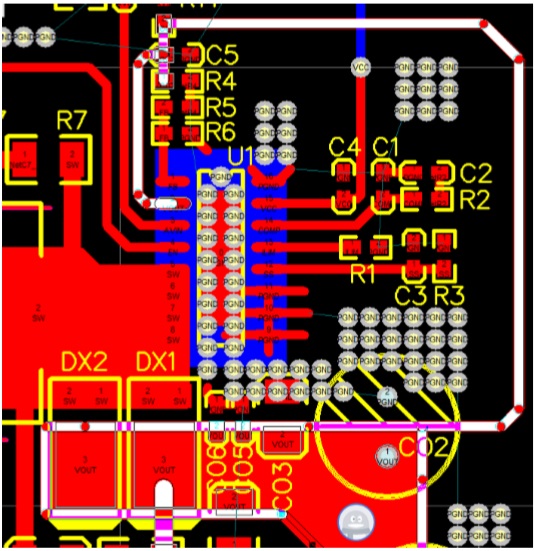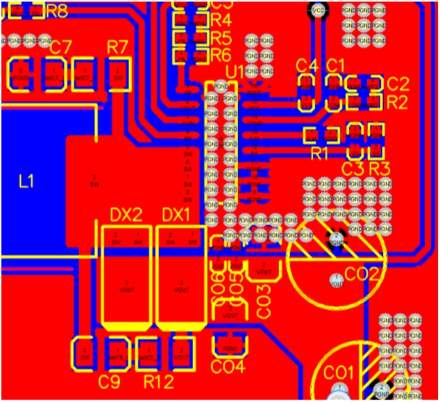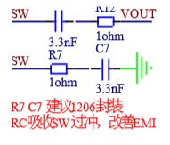 5、SW上RC在DEMO中,增加兩組RC,分別為SW到GND和SW到VOUT,目的是減小SW開關(guān)時候產(chǎn)生的過沖,保護芯片,同時可以改善EMI。注意RC封裝,R的封裝不應(yīng)太小,建議1206。