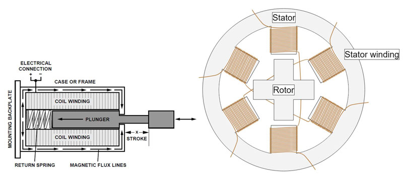 圖 1:螺線管的結(jié)構(gòu)包括帶內(nèi)部滑動(dòng)柱塞的繞接線圈(左圖);步進(jìn)電機(jī)則更為復(fù)雜,轉(zhuǎn)子上有永磁體,定子上有電磁線圈(右圖)。(圖片來(lái)源:Analog Devices、Monolithic Power Systems)