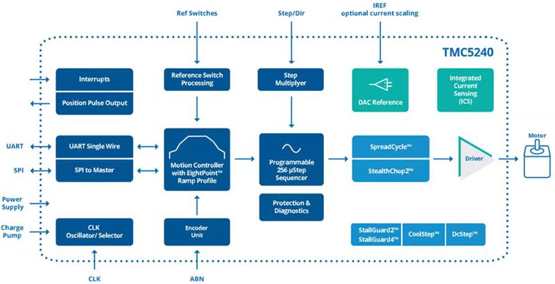 TMC5240 具有獨(dú)特的先進(jìn)功能,可實(shí)現(xiàn)更高的精度,并支持高能效、高可靠性、平滑運(yùn)動(dòng)以及低溫運(yùn)行。這些功能包括: