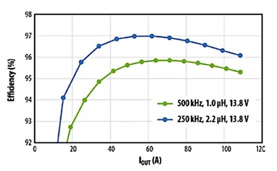 圖 4 顯示了效率結(jié)果。在 250 kHz 頻率下,使用 2.2H 電感器,轉(zhuǎn)換器實(shí)現(xiàn)了 97% 的峰值效率。當(dāng)使用 1.0 H 電感器在 500 kHz 頻率下工作時,峰值效率為 95.8%。