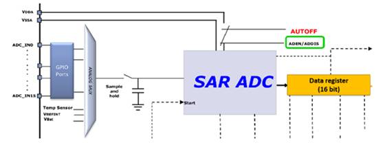 它有多達 19 個通道,可測量 16 個外部通道(從外部GPIO口連接的16通道模擬輸入)