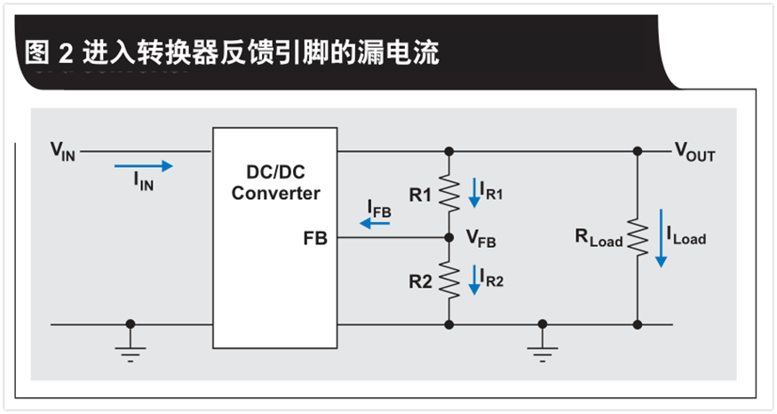 我們剛剛討論了如何利用大反饋電阻來提高效率。然而,選擇的電阻過大則會影響轉換器的輸出電壓精確度。因為存在進入轉換器反饋引腳的漏電流。