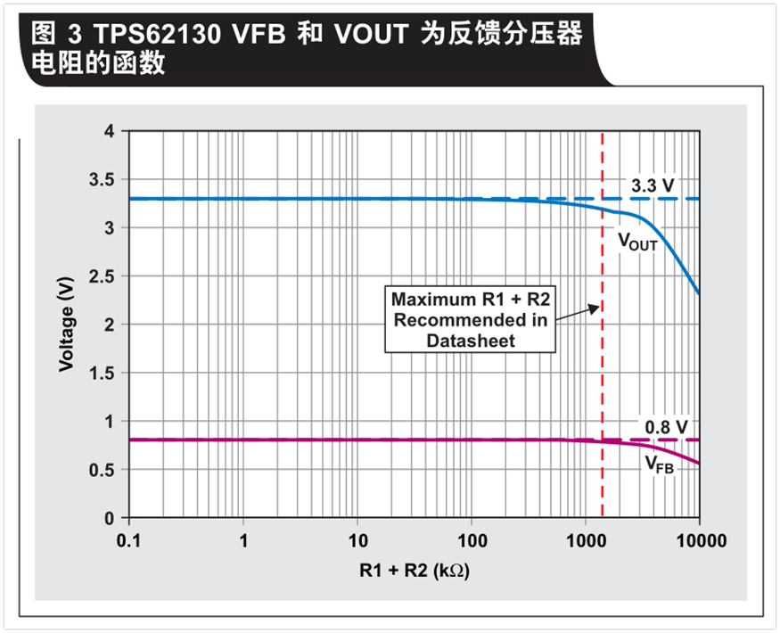 方程式1和TI的TPS62130降壓轉換器用于繪制反饋引腳電壓及相應輸出電壓情況,其為反饋分壓器電阻的函數(shù)(請參見圖3)。該電壓圖基于理想電阻,其可產(chǎn)生一個3.3V的輸出電壓,并且反饋引腳電壓為0.8V。需要考慮的唯一誤差項是產(chǎn)品說明書中規(guī)定的100nA最大反饋漏電流。