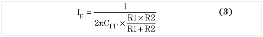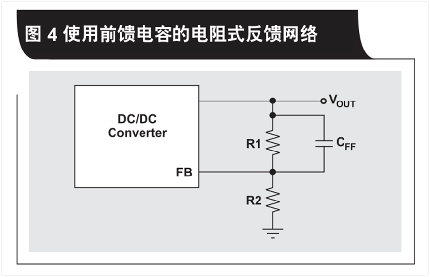 根據(jù)不同的控制拓撲,產(chǎn)品說明書可能會要求或者建議電阻式反饋網(wǎng)絡使用前饋電容( CFF )。圖4顯示了這種裝置。給電阻式分壓器添加前饋電容可產(chǎn)生零點和極點,增加轉換器的相位裕量和交叉頻率,從而獲得一個更高帶寬、高穩(wěn)定性的系統(tǒng)。