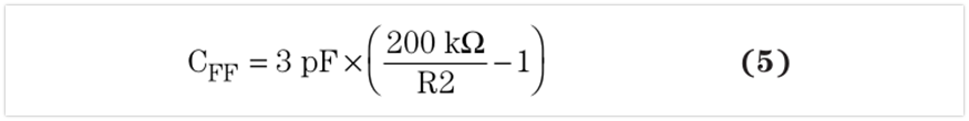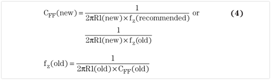 很明顯,零點和極點都與電阻分壓器和前饋電容所使用的值有關。因此,增加或降低電阻值來優(yōu)化效率、電壓精度或者噪聲,會改變系統(tǒng)的整體環(huán)路。要想保住穩(wěn)定性,需要根據(jù)前面的零點或者是產(chǎn)品說明書建議的零點(哪個值可用,就用哪個值),用方程式4計算一個新的CFF值: