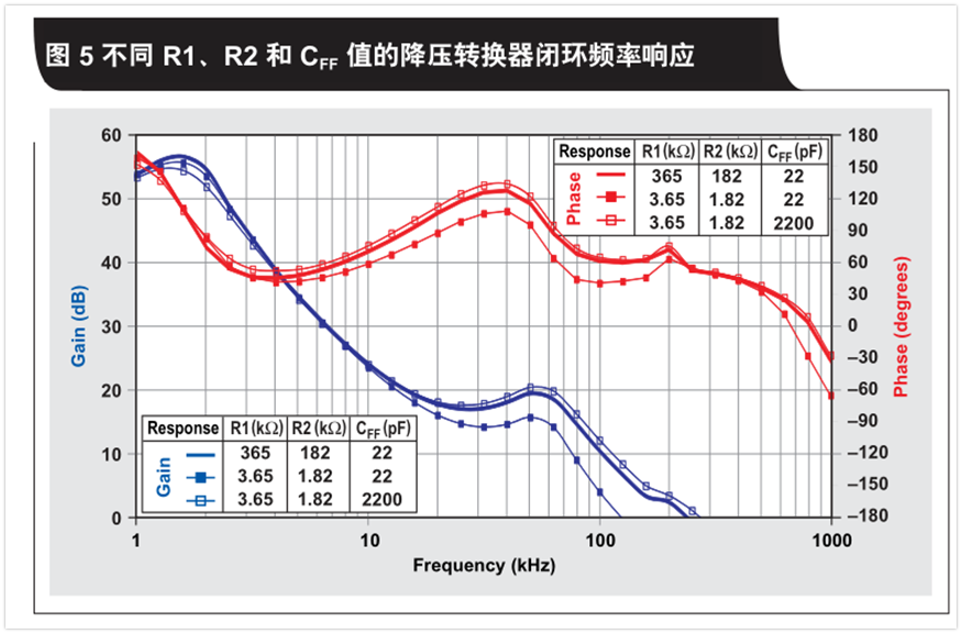 對于一個在其控制拓撲中使用前饋電容的轉換器來說,改變電阻式分壓器的值很容易讓轉換器穩(wěn)定降低。但是這個例子僅僅表明,只要前饋電容調節(jié)適當,改變這些值便可維持相同的頻率響應和瞬態(tài)響應。