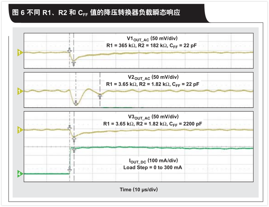 圖5和圖6分別顯示了三種不同電阻式分壓器網(wǎng)絡的閉環(huán)響應及其相應瞬態(tài)響應。每個網(wǎng)絡都使用一個前饋電容,以描述分壓器網(wǎng)絡組件如何改變降壓轉換器穩(wěn)定性。當使用分壓器網(wǎng)絡組件的產(chǎn)品說明書建議值時(R1=365 kΩ,,R2=182 kΩ和CFF =22pF),轉換器穩(wěn)定,并且相位裕量為59°。它的瞬態(tài)響應對此進行了驗證,其輸出電壓稍許下降,并且沒有振蕩。